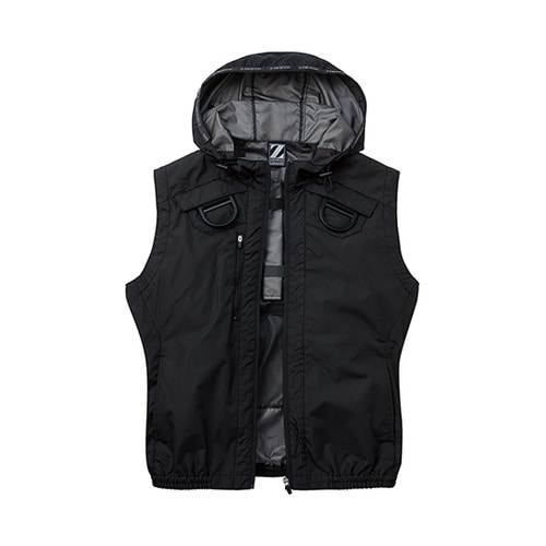 収納可能なフックハンガーを搭載したフルハーネス対応空調服ベスト。遮熱加工により、未加工布と比較し−3℃以上を実現。