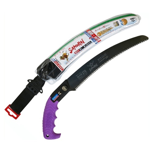 SAMuRAiブランドの神沢精工の特許曲刃鋸。荒目・中目の三段刃を一つにまとめた刃で、太い木から細い枝まで切断可能。山林、造園、果樹、仮枠に適しています。 |