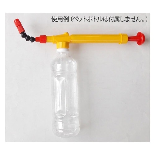 ペットボトル利用の簡易スプレーです。先端ノズルは自在に可動できるので便利です。水量調節つまみでジェットやミストでスプレー可能です。高所の殺虫・洗浄などに重宝します。 |