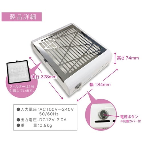 ネイルマシンでオフをする時に飛び散るダストを、静かにパワフルに吸引する集塵機。静音設計だから時間や場所を気にせずお使いいただけます。 |