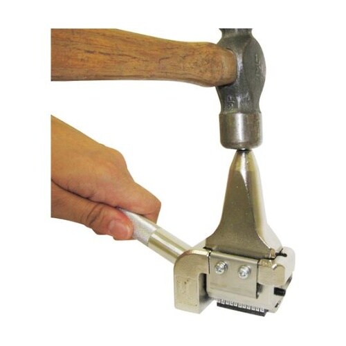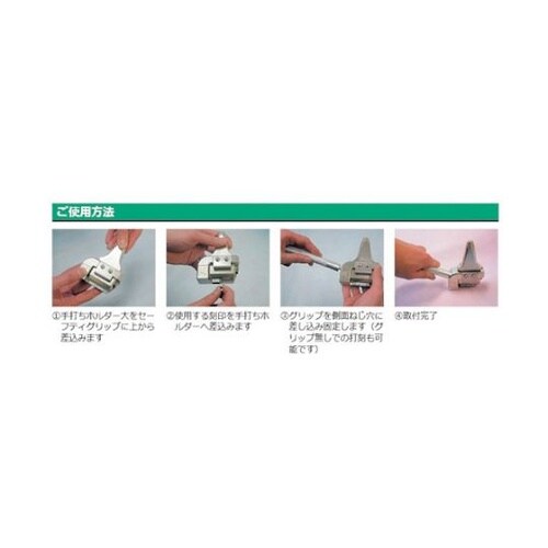 手打ホルダ(大)専用の打刻支援ツールです。ホルダのみの打刻ではハンマーで誤って手を打ってしまうなどの危険が伴いますが、セーフティグリップを使用することで安心、安全に打刻作業が行えます。 |