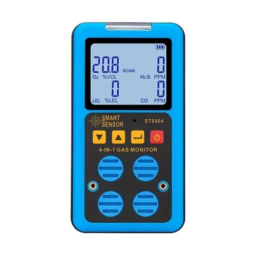 特徴:O2、LEL(可燃性ガス)、CO、H2Sの4種類のガスを同時連続で検出するポータブルマルチガス検出器です。各ガス濃度の測定値はLCDに表示されます。 |