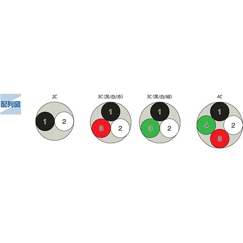 VCTケーブルはビニルキャブタイヤケーブルの略で、交流600以下直流750V以下の移動用電気機器の電源、配線として広くご使用していただけます。当商品は、常時、屈曲・捻回する用途には適していません。 |