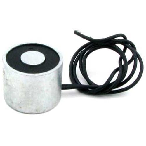 通電することで磁力を発生させる磁石。目安として約5kgの重さを保持する磁力があります。裏面にネジ穴付で本体を固定可能。 |