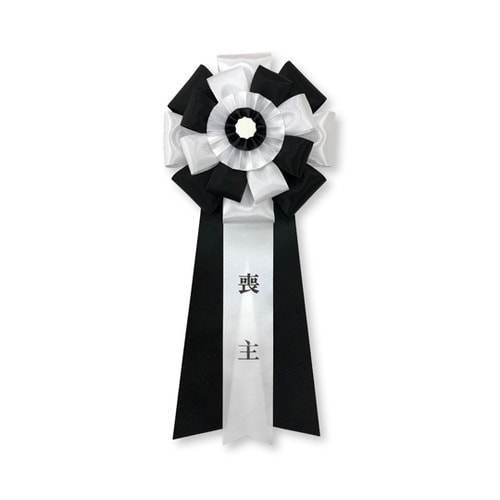 葬儀用のリボン徽章(記章・胸章)です。タレに「喪主」の印字があります。安全ピン付き。 |