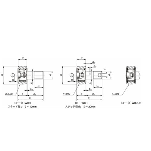 タイプ:CF−WBUUR | 材質:炭素鋼製 | シール部の構造:シール形 | 外輪外径面の形状:球面外輪 | 主要寸法(mm)D:19 | 主要寸法…