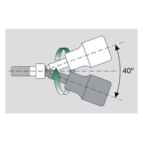 頑丈な圧入式の1/2”SQボールポイントヘックスビットソケット。25°まで傾けて回すことができる。 |