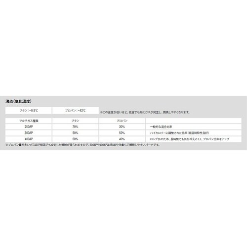 カートリッジ式ガス逆さ使用可能でも安定した炎。ブタン70%、プロパン30%で強力炎。 |