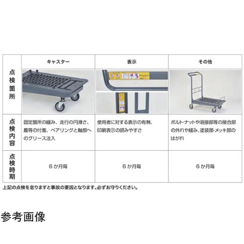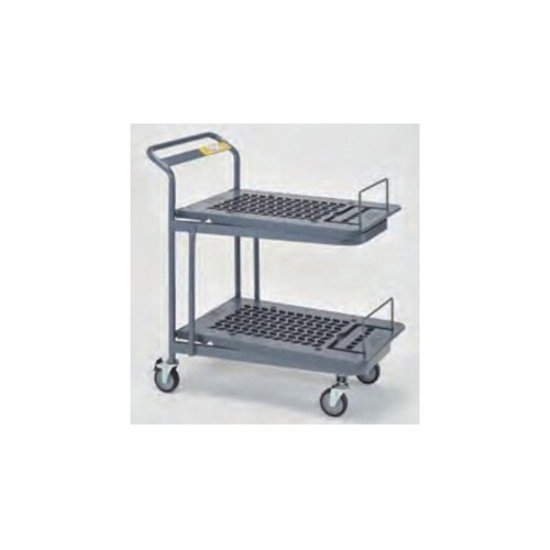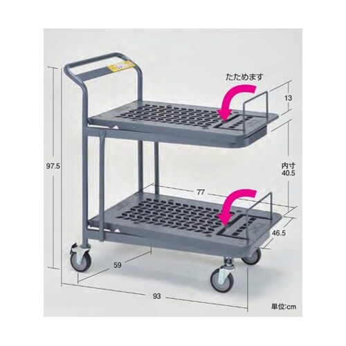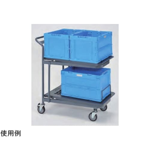 ネスティング可能な2段台車です。全面ストッパー付きです。前輪自在、後輪固定ストッパーキャスター付きです。滑り止めゴム付きです。 |