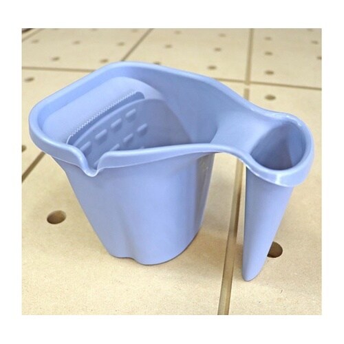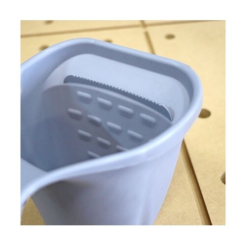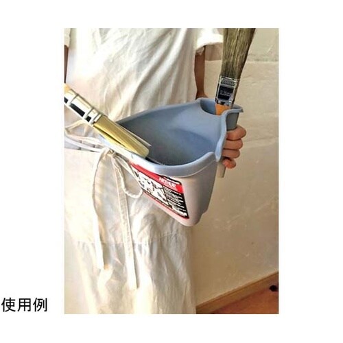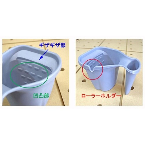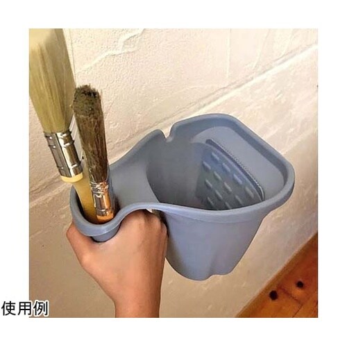片手に収まる多機能塗料ポットです。持ち手部分はブラシホルダーとしても使用できます。ポット内側の凹凸加工で、ローラーに付ける塗料を均等に伸ばせます。側面にはローラー用ホルダーを設けました。 |