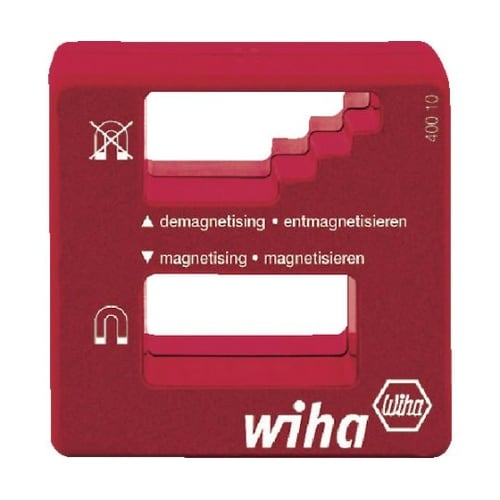 ドライバーやピンセットなどの鉄製の工具の磁化及び脱磁ができます。磁化するにはプラスマークの穴に工具を通し、脱磁するにはマイナスマークの穴の中をすべらせます。工具の着脱磁に。 |