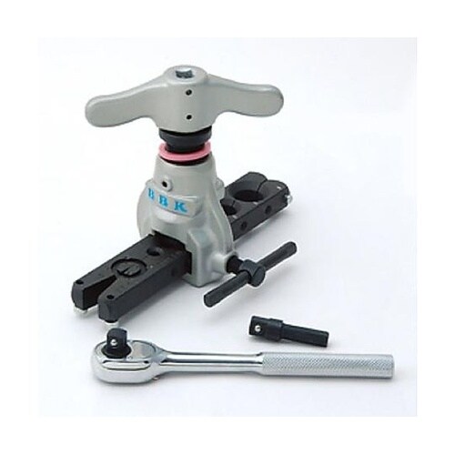 電動ドリルドライバー、ラチェットハンドル、手動と3通りの使い方ができます。3/8”ラチェットハンドル、3/8”四角ドリルアダプター付電動ドライバーを使用してフレアが作れるフレアツールです。 |