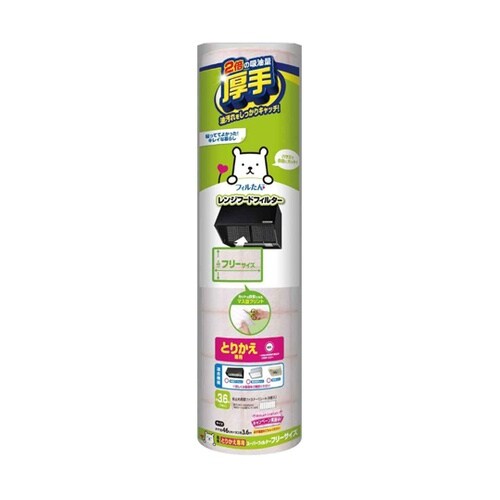 レンジフードの大きさに合わせて必要な分だけカットできるロールタイプのフィルターです。吸油力が高い厚手のフィルターを使用していますので、しっかり油汚れを防ぎ、長くお使いいただけます。 |