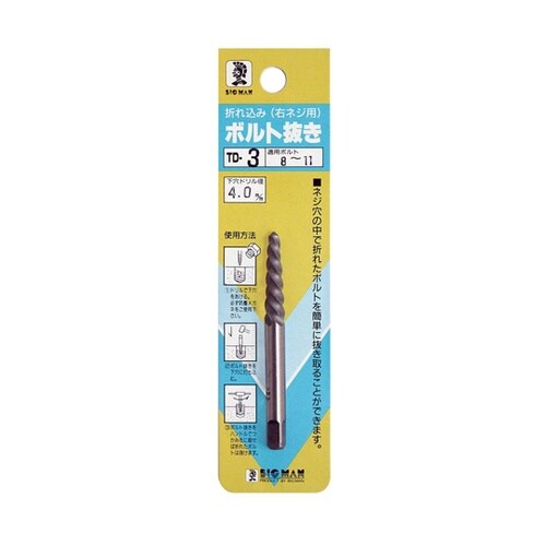 ボルト抜きとして。ネジ穴の中で折れたボルトを簡単に抜き取ることができます。ボルト抜き作業は相当に無理をする為、ボルト抜きが折れたり破損することがあります。 |