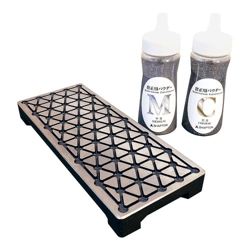 荒砥石やブロックでは得られないシャープな仕上り。幾何学模様の溝が、パウダーと盤の相乗効果を高め、早く正確に仕上ります。セラミック砥石以外の砥石の修正もできます。 |