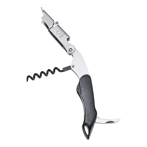 フックが2段階式だから最後までコルクがまっすぐ上に引き上げられスムーズに、そして失敗なく抜栓できます。▼(1)1段目のフックを指で押しボトルに掛けたらコルクを1/2位抜きます。 |