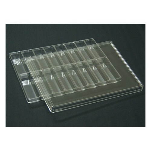 サンプル保管用APETトレーです。透明フタ、収納用のスリーブケース付きです。外寸をA11サイズで統一しており、本棚等での保管が容易です。 |