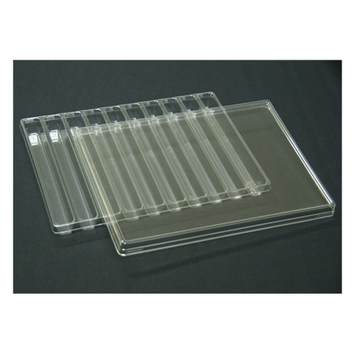 サンプル保管用APETトレーです。透明フタ、収納用のスリーブケース付きです。外寸をA14サイズで統一しており、本棚等での保管が容易です。 |