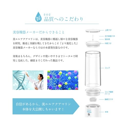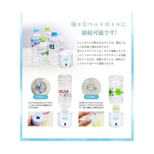 高濃度 水素水生成器「美ルルアクアマリン」はお手持ちのペットボトルに接続して水素を発生させます。ボトル一体型と比べ、軽量で持ち歩きやすくどこでも手軽に水素水を飲むことができるのです。 |