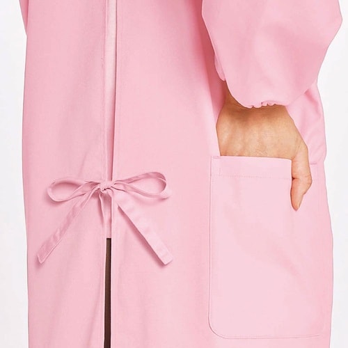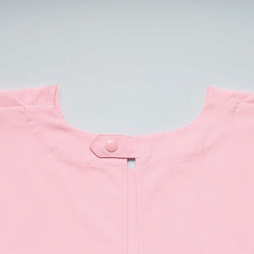 首元は着脱しやすいドットボタン仕様。介護の邪魔にならないよう、右後ろにもポケット付。 |