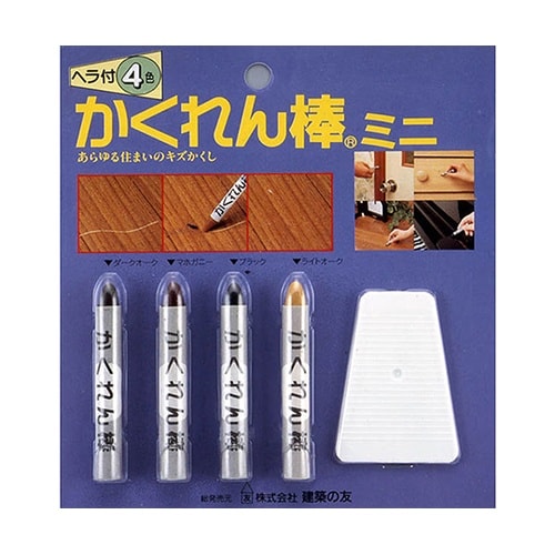 フローリングや木製品の補修に最適!キリキズに直接スり込めるソフトタイプ。便利な4色セット!簡単に素早く補修ができます。かくれん棒同士で調色ができます。施工後の収縮、ひび割れは、ほとんどありません。 |