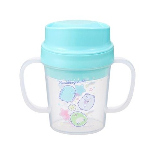 コップが倒れても飲み物がこぼれにくいトレーニングコップです。90度以上傾けると飲むことができるので、自然とあごをあげるくせがつきます。 |