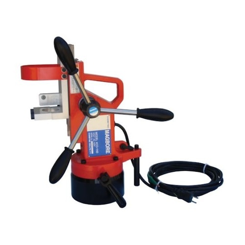 卓上ボール盤のポータブルタイプです。吸着部は丸形マグネットで、回転角度は320度。それぞれ裏当材を使えば、薄鋼板にも穴あけが可能。電気ドリルは付属していません。 |