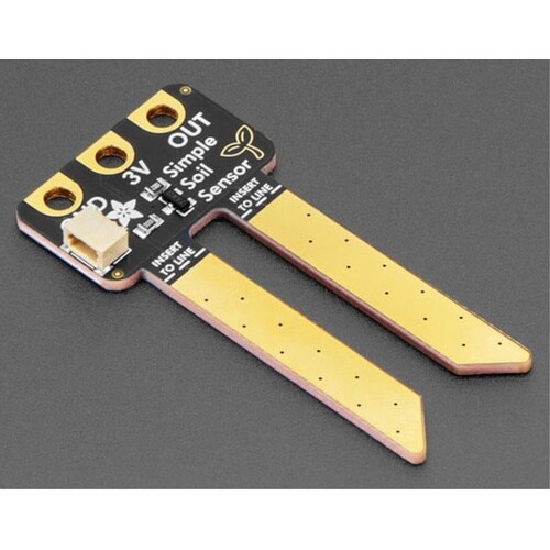 教育用途に最適な土壌水分センサーです。シンプルな 抵抗型水分センサーで、2つの電極間の導電率を測定します。電極には金メッキを施し、酸化のリスクを軽減しています。 |