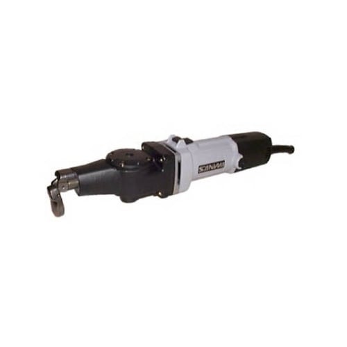 タテ型のため狭いところの作業が可能です。刃物は4面使えて経済的です。切断半径が小さいため直角に切断可能です。ハサミ構造の二枚刃のため切りくずが出ません。軟鋼、ステンレス、アルミニウム板の切断。 |