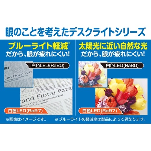 眼のことを考えたデスクライト:高演色(Ra97)LEDによりブルーライトを軽減※し、太陽光に近い自然な光を実現。眼が疲れにくい。 |