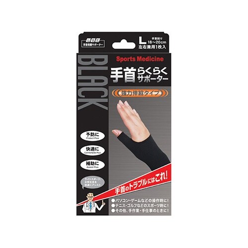 手首の保護サポーター。強力伸縮タイプで負担を軽減、関節の動きを妨げません。親指の付け根(球筋群)、手首(筋支帯群)の過度の負担で起きる炎症等を和らげます。 |