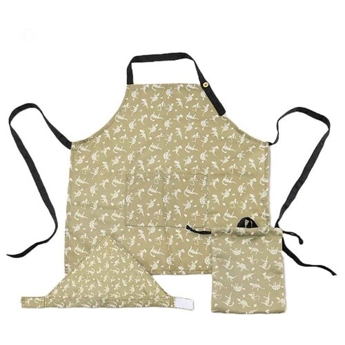 子ども用エプロン・三角巾・巾着の3点がセットになっています。小さなお子様でも簡単に着脱ができるよう、エプロンの腰ひもと三角巾には幅広の面ファスナーが使用されています。 |