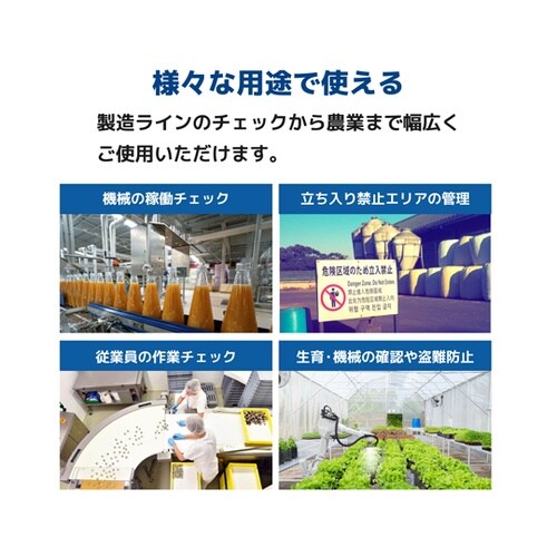 ワイヤレス接続&モニター・レコーダー一体型で、面倒な配線工事が大幅削減。AI機能を設定することで、人だけ検出してアラーム通知することが可能。専用アプリによりスマホで遠隔地からの監視が可能。 |
