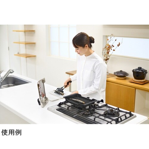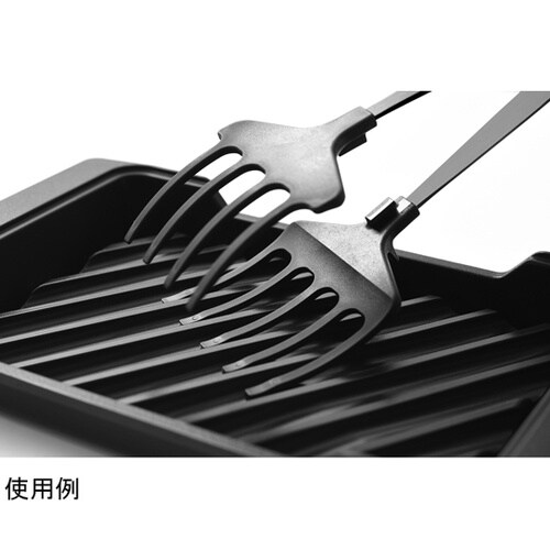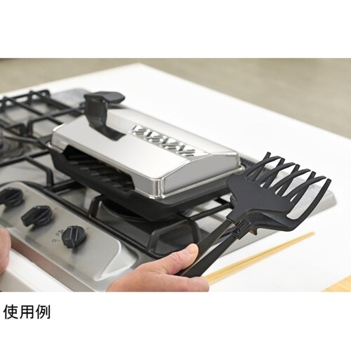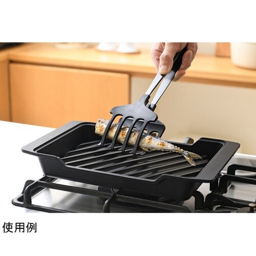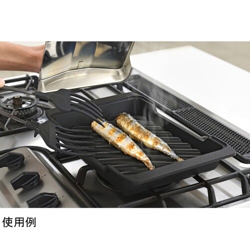 魚をはさむ先端部はカーブが大きく安定感があり、どんなサイズの魚も無理なくつかめます。焼き上がりを皿に盛り付けるときもスムーズです。先端が浮くので置いた時にテーブルを汚しません。 |