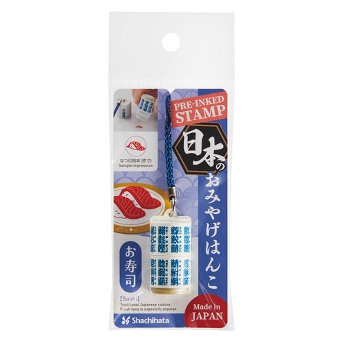 日本の観光地や文化をモチーフにした、ストラップ付きのミニはんこです。全6種のデザインがあり、インキ内蔵で約1,000回なつ印可能。日本のお土産にぴったりです。 |