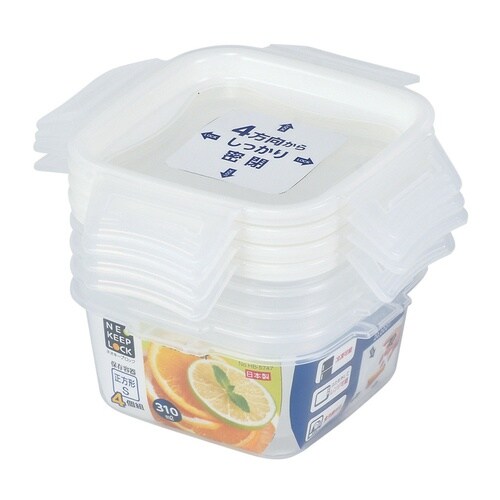 毎日使える正方形の保存容器 容量310mlサイズ 4個入です。 ふたは、4方向からしっかりとロックができます。 ふたを外してレンジ加熱が可能です。 ふたとパッキンが一体型なのでお手入れも簡単です。 |