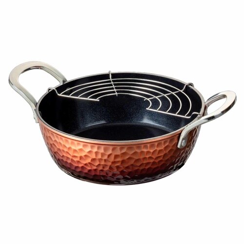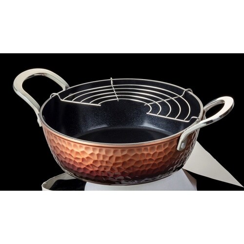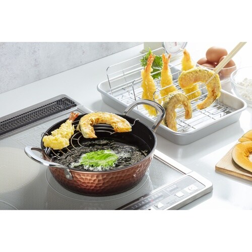 厚底なので油温が下がりにくく、カラッと揚がる天ぷら鍋です。 表面は槌目加工になっており、強度があります。 内面のセラミック加工でお手入れ簡単です。 専用の揚げ網が付属しています。 |