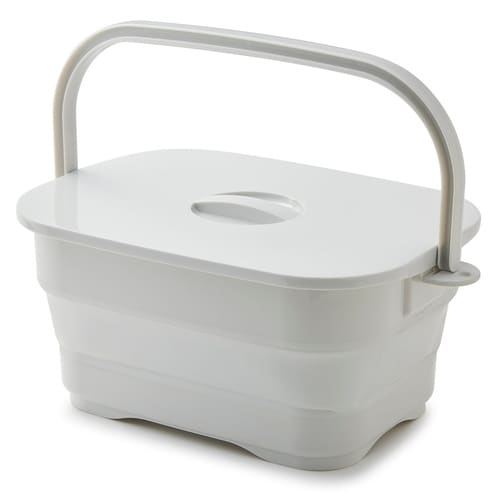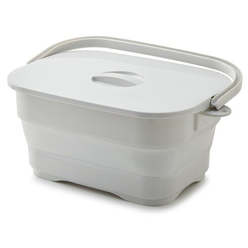 折りたたんでスリムに収納できるバケツ16Lです。 高さ調節可能な落し蓋で、つけ置き洗濯物の浮き上がりをガードします。 蓋付きで見せたくない物のつけ置きも安心です。 水抜きは底の栓からラクに行えます。 |