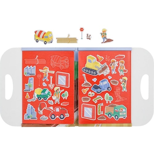 働くクルマや人、工事現場のパーツを貼って遊べるマグネットシートです。 工事現場の背景に、キャラクターを置いてストーリーを考えましょう。 |