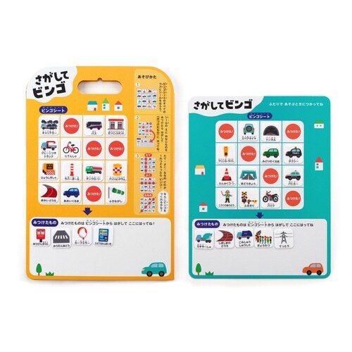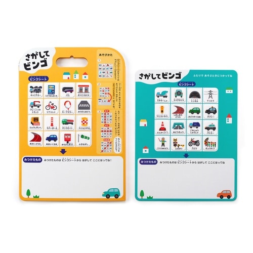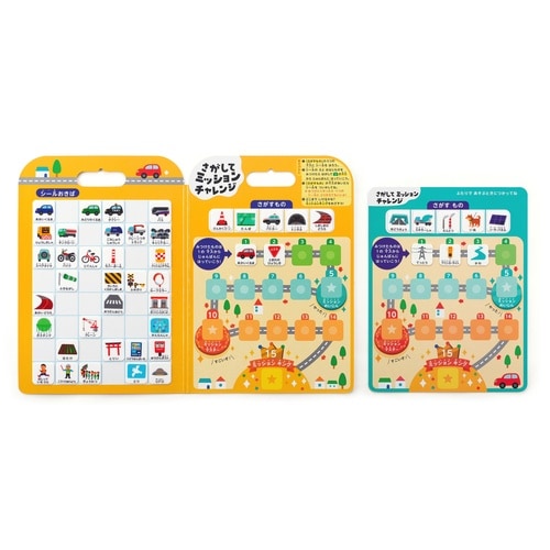 車に乗りながら親子一緒に楽しめる「さがしてミッション」です。 車窓の景色からさまざまなアイテムを見つけて台紙に貼る遊びです。 |