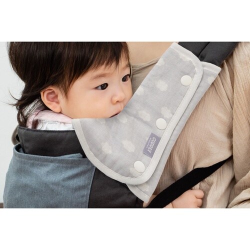 L字なので抱っこ紐の角をカバーできます。 表地は肌に優しいダブルガーゼ、裏地は撥水性のあるナイロンを使用しています。 安心して使える日本製です。 |