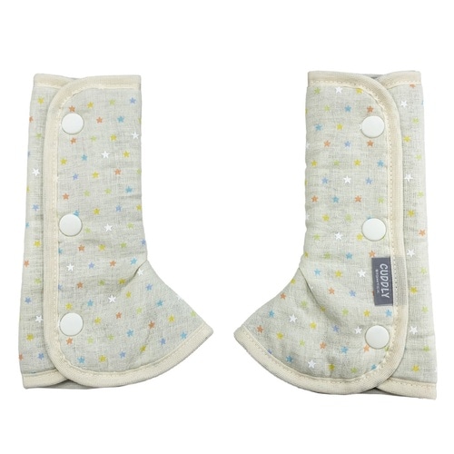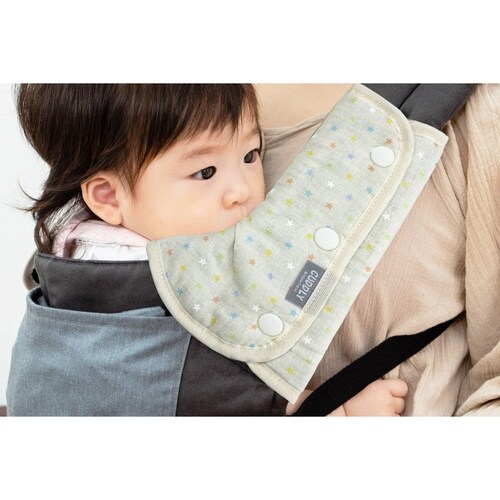 L字なので抱っこ紐の角をカバーできます。 表地は肌に優しいダブルガーゼ、裏地は撥水性のあるナイロンを使用しています。 安心して使える日本製です。 |