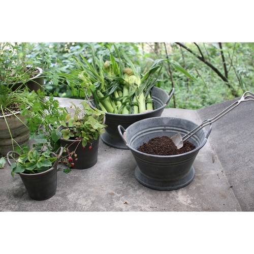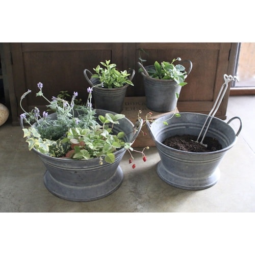 ナチュラルで素朴な風合いが魅力のブリキポットです。 グリーンやハーブの寄せ植えに適しています。 プランターとしてだけでなく、鉢カバーとしても使用可能です。 |