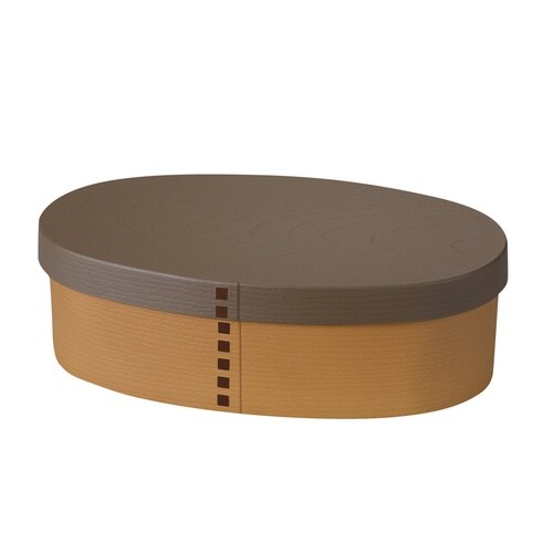 シックなアースカラーと木目調のデザインが新しい、曲げわっぱ風のお弁当箱です。 |