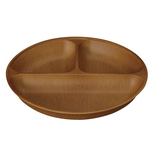 温かみのある木の風合いが感じられる木目調の丸ランチプレートです。 樹脂製なので、落としても割れにくく、軽量で扱いやすいです。 |