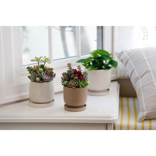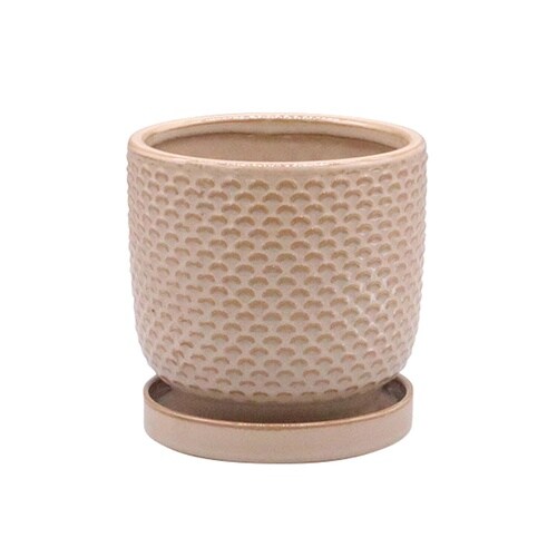 ナチュラルな雰囲気が可愛いフラワーポットです。 水抜き用の底穴がついています。 受け皿が付いているので室内での使用にもぴったりです。 |