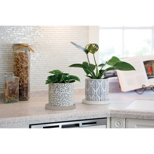 インテリアに馴染むシンプルなデザインです。 ソーサー付きで、底穴も空いているのでお部屋に置いたまま水やりが可能です。 表面には撥水加工のプリントが施されています。 |