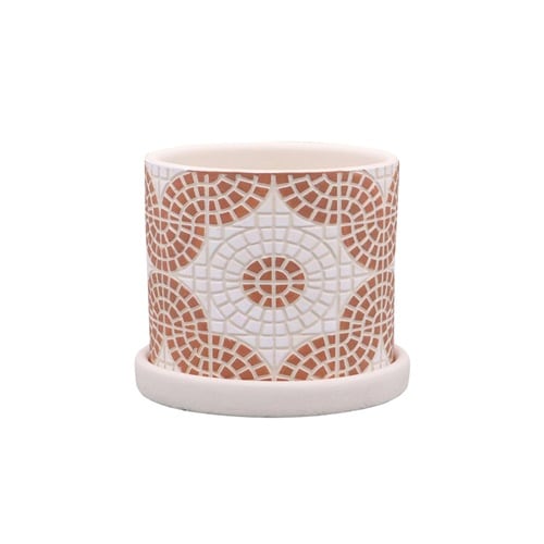 様々なタイル風デザインのフリーゼポット Lサイズです。 そのまま置いておけるソーサー付きです。 底穴ありです。 |