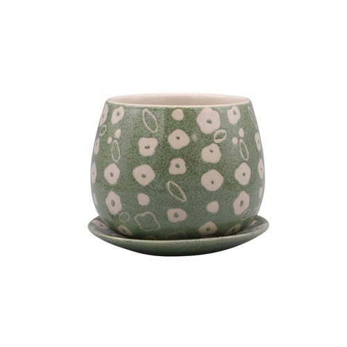 東欧風の絵柄がかわいいセラミックポットです。 テーブルサイズの観葉植物などを植えるのにぴったりなサイズ感です。 そのまま置いておけるソーサー付きです。 底穴ありです。 |