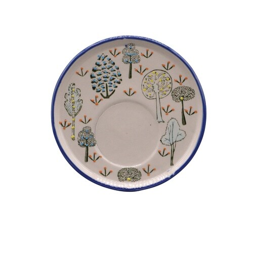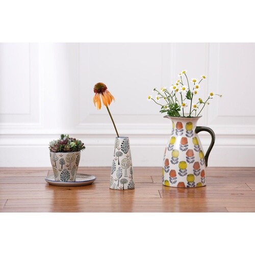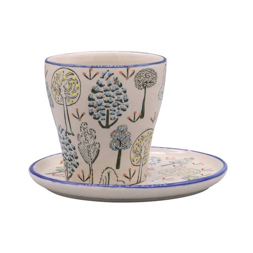 植物の柄が可愛いフラワーポットです。 水抜き用の底穴がついています。 受け皿が付いているので室内での使用にもぴったりです。 |